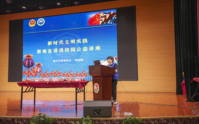 为深入贯彻落实习近平总书记关于“重点针对青少年等群体,深入开展毒品预防宣传教育”的重要指示精神,响应新时代文明实践志愿服务的号召,引导高校学生追求健康文明的生活方式,6月24日,潍坊市禁毒协会联合山东畜牧兽医职业学院开展了以“珍爱生命,远离毒品”为主题的禁毒知识讲座,山东畜牧兽医职业学院团委副书记徐静、动物科技学院副书记都振玉、潍坊市禁毒协会会长张焱共同出席了活动。
