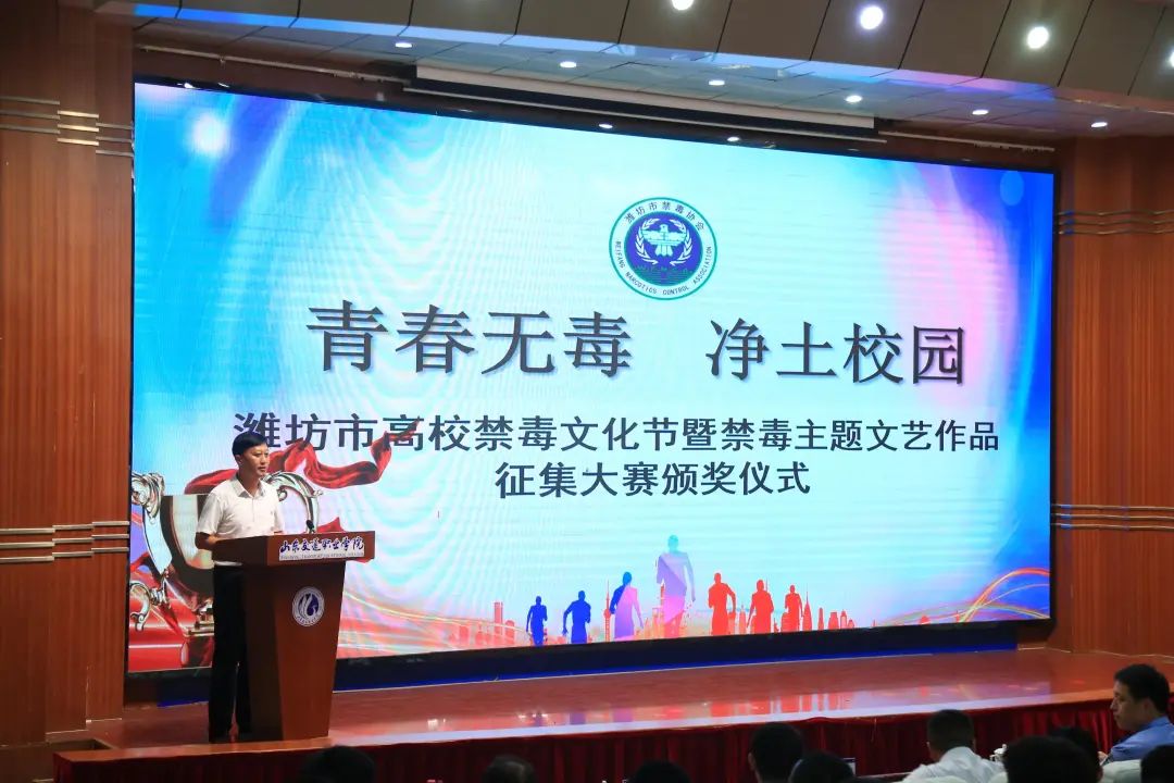6月20日上午,在第36个国际禁毒日来临之际,“青春无毒、净土校园”潍坊市高校禁毒文化节暨禁毒主题文艺作品征集大赛颁奖仪式在山东交通职业学院举行。潍坊市禁毒办副主任、潍坊市公安局禁毒支队支队长王磊、潍坊市新时代文明实践中心主任路全东、共青团潍坊市委副书记孙在前、山东交通职业学院副院长李德福、潍坊市禁毒协会会长张焱及坊子区禁毒办、山东交通职业学院师生代表、参赛作品获奖代表、高校禁毒志愿者等300余名人员共同参加了颁奖活动。